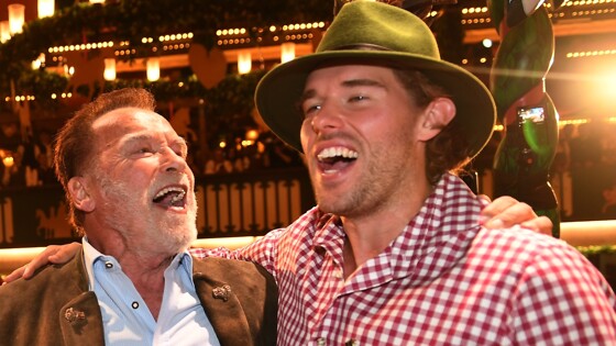 Также Шварценеггер-младший надел кроссовки и завязал свитшот на талии. Кроме того, он уложил назад волнистые волосы. Также во внешнем облике молодого человека привлекают внимание борода и усы.