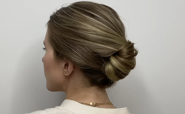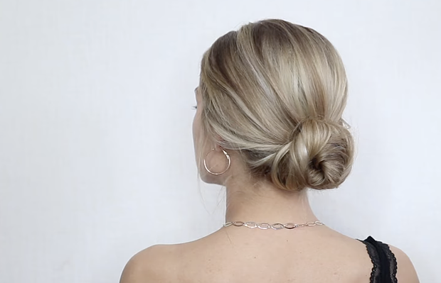 Нанесите текстурирующий спрей, слегка начешите волосы у корней для объема. Соберите волосы в низкий хвост, не затягивая. Скрутите в свободный пучок и закрепите шпильками, вытянув несколько прядей у лица для создания эффекта небрежности.