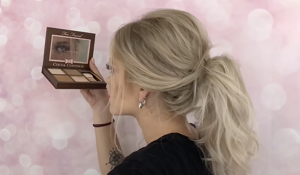 Нанесите спрей для объема и слегка начешите волосы у корней на макушке. Соберите волосы в очень высокий хвост. Чтобы добавить шика, отделите тонкую прядь от хвоста и оберните ею резинку, закрепив невидимкой. Можно слегка завить хвост в крупные мягкие локоны для еще большего объема.