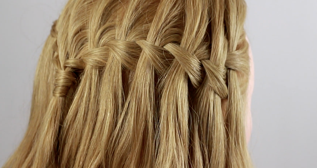На слегка волнистых или прямых волосах сделайте пробор. Сплетите небрежную французскую косу от виска, но вместо того чтобы вплетать все нижние пряди, выпускайте их вниз, создавая эффект «водопада». Остальные волосы завейте в легкие локоны.
