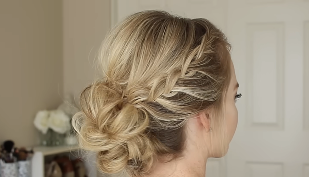 Разделите волосы на три части: две по бокам у висков и одну основную сзади. Основную часть волос соберите в низкий хвост, а затем скрутите из него аккуратный пучок, закрепив его шпильками. Боковые пряди заплетите в тонкие косички (французские или обычные) и оберните ими пучок, тоже зафиксировав их невидимками. Выпустите несколько тонких прядей у лица.