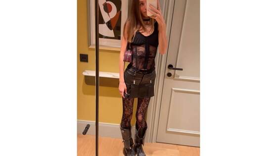 25-летняя манекенщица предстала перед камерой в черном наряде. Так, она надела полупрозрачный корсетный топ, кожаную мини-юбку и кружевные колготки.