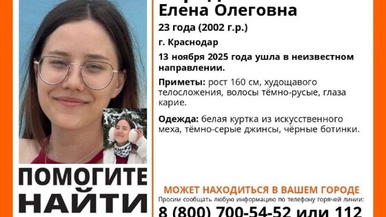 В поисках краснодарки участвуют волонтеры, но пока результатов нет. Отряд «Лиза Алерт» распространяет ориентировки с фотографией пропавшей. Известно, что ее рост 160 см, а телосложение худощавое. У Елены темные волосы и карие глаза.
