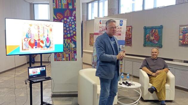 В выставочном зале им. К. Малевича прошел вечер с Владимиром Тельных, членом Союзов художников и дизайнеров России. Владимир начал свой путь в искусстве с учебы на художественно‑графическом факультете Курского пединститута. Сейчас он работает в разных направлениях: делает маленькие броши и берет крупные заказы - например, создал занавес для одного из курских вузов. Больше всего ему нравится работать с тканями, но он не ограничивается только этим. Гостям показали часть его коллекций. Самое интересное - напёрстки: Тельных начал их коллекционировать после того, как в 2013 году получил в подарок от сестры серебряный напёрсток. С тех пор он продолжает их собирать и стал диджитабулистом — так называют коллекционеров напёрстков. Мастер признался, что вдохновение черпает в природе, людях и повседневных впечатлениях. Он с удовольствием отвечал на вопросы и вспоминал интересные эпизоды из жизни.