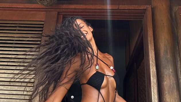 29-летняя Нара Баптиста позировала перед камерой в черном бикини на фоне спальни. Модель была запечатлена с распущенными волосами и без косметики.