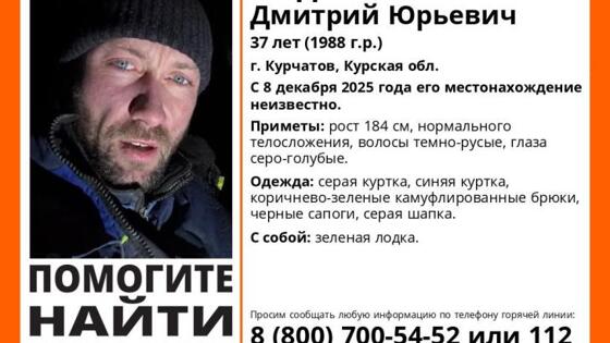 Волонтеры поискового отряда "Лиза Алерт" сообщают приметы пропавшего 37-летний житель Курчатова Фадеев Дмитрий Юрьевич пропал 8 декабря. До сих пор его местонахождение неизвестно. Его приметы: рост 184 см, нормального телосложения, волосы темно-русы, глаза серо-голубые. Был коричнево-зеленые камуфлированные брюки, черные сапоги, серую шапку, а также в две куртки - серую и синюю. С собой у него была зеленая лодка.