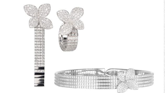 Бриллиантовый поток напоминает естественное течение реки, олицетворяя собой жизненный путь. В каждом украшении есть акцентный элемент - цветок из четырех лепестков. Коллекция представлена колье-чокером, браслетами, кольцами и серьгами из белого золота с бриллиантами.