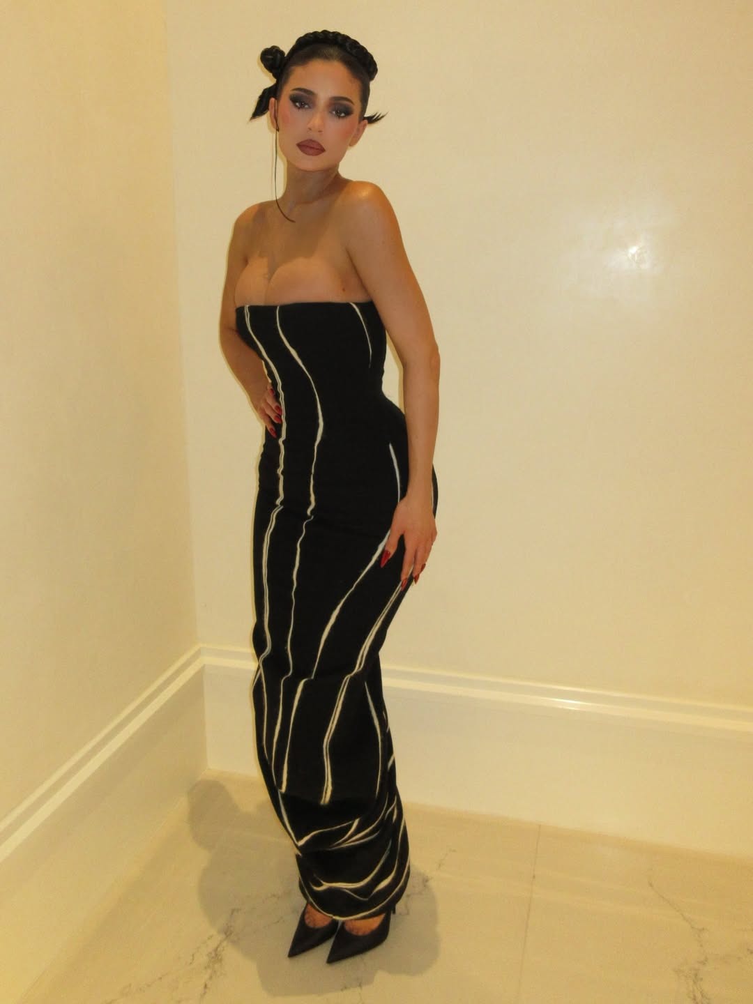 Кайли Дженнер показала кадры, сделанные во время празднования католического Рождества. Для мероприятия модель выбрала винтажное облегающее макси-платье от Джонна Гальяно с драпировкой снизу. Бизнесвумен добавила к образу туфли на каблуках в тон. Звезде реалити-шоу сделали укладку с косами и макияж с темными тенями, контурингом, румянами и матовой темно-розовой помадой.