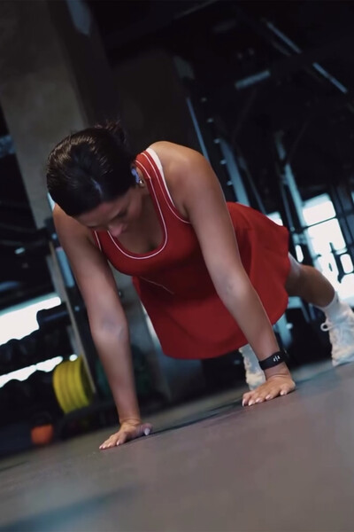Нюша в комбинезоне с глубоким декольте и юбкой сделала планку на камеру в спортзале. Певица также выполнила несколько физических упражнений на разные группы мышц. При этом она отказалась от макияжа и укладки.