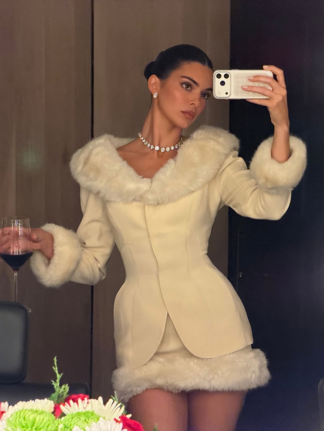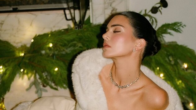 30-летняя Кендалл Дженнер позировала в кадре в молочном костюме с меховой отделкой, который состоял из приталенного жакета и мини-юбки. Модель добавила к комплекту серьги с бриллиантами и ожерелье. Звезда реалити-шоу собрала волосы в гладкий пучок и сделала макияж с черной тушью, румянами и розовой матовой помадой.