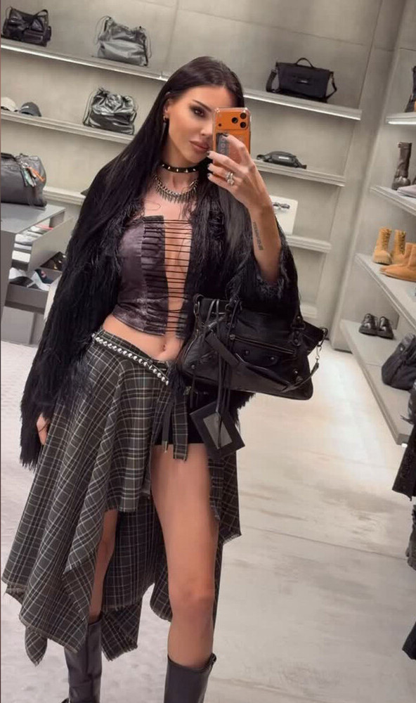 37-летняя Оксана Самойлова стояла перед зеркалом в фиолетовом топе со шнуровкой без бюстгальтера, который сочетала с клетчатой юбкой с разрезом до бедра и пушистой накидкой. Блогерша добавила к образу высокие кожаные сапоги, чокер с шипами, черную сумку Balenciaga, серьги и кольцо. Знаменитость была запечатлена с распущенными волосами и макияжем с черными тенями.