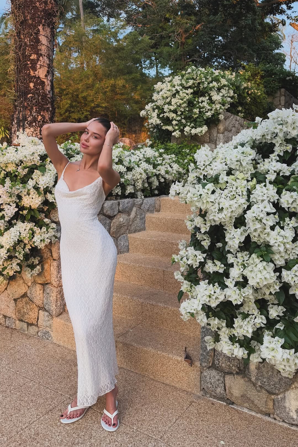 19-летняя Аврора Киба предстала перед камерой в белом кружевном макси-платье с глубоким декольте, которое дополнила вьетнамками в тон, кольцом и браслетом. Девушка позировала с уложенными волосами и макияжем в естественном стиле на фоне лестницы и цветов.