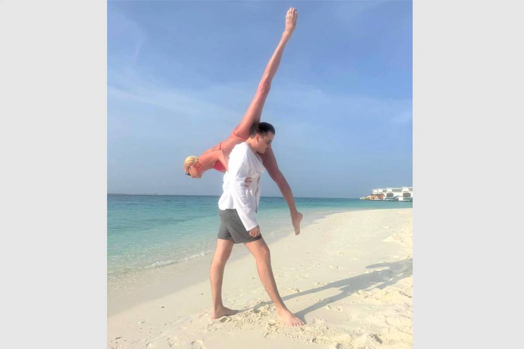 49-летняя знаменитость поделилась снимком с отдыха на Мальдивах. На кадре она продемонстрировала шпагат на плече своего спутника, который держал звезду, стоя на пляже.