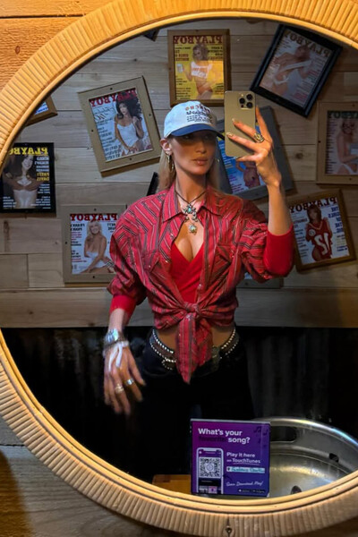 Белла Хадид стояла перед зеркалом в красном облегающем топе с глубоким декольте, который дополнила рубашкой в клетку в тон. Модель также надела синие джинсы с коричневым ремнем, бело-синюю кепку, ожерелье, серьги, кольца и браслеты. Манекенщица позировала с распущенными волосами и макияжем.