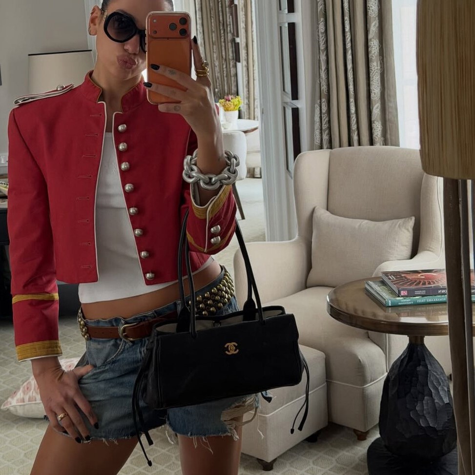 Дуа Липа появилась на публике в синих шортах с рваниной и карманами, белом топе и красном «гусарском» жакете. Образ дополнили очки и сумка Chanel. Волосы певица собрала в пучок и сделала легкий макияж.