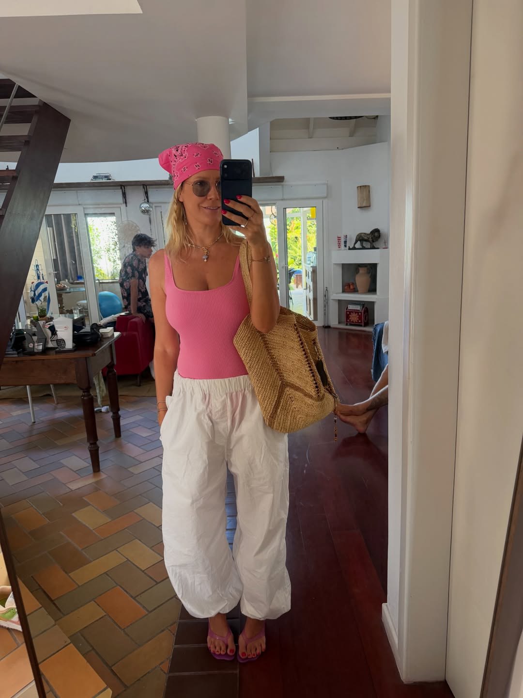 47-летняя Елена Летучая стояла перед зеркалом в розовом слитном купальнике, который сочетала с белыми широкими брюками, сланцами в тон и косынкой. Телеведущая добавила к образу большую плетенную сумку, браслеты, кольца и солнцезащитные очки. Знаменитость позировала с распущенными волосами и без косметики. Снимок был сделан во время отдыха артистки в Бразилии.