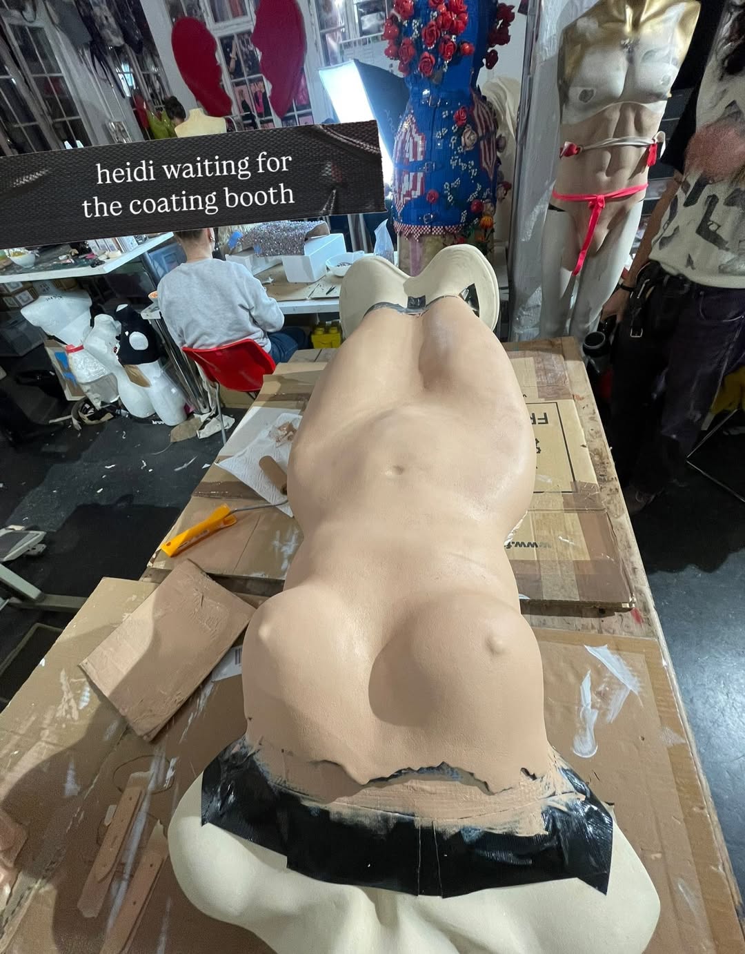 Манекенщица поделилась фото, на которых команда модельера изготавливала вирусное платье. На размещенных кадрах видно, что сначала авторы платья сделали гипсовый слепок голого тела Клум, после чего натянули на него кожаную ткань, а в конце покрыли наряд специальной краской, которая создавала эффект латекса.