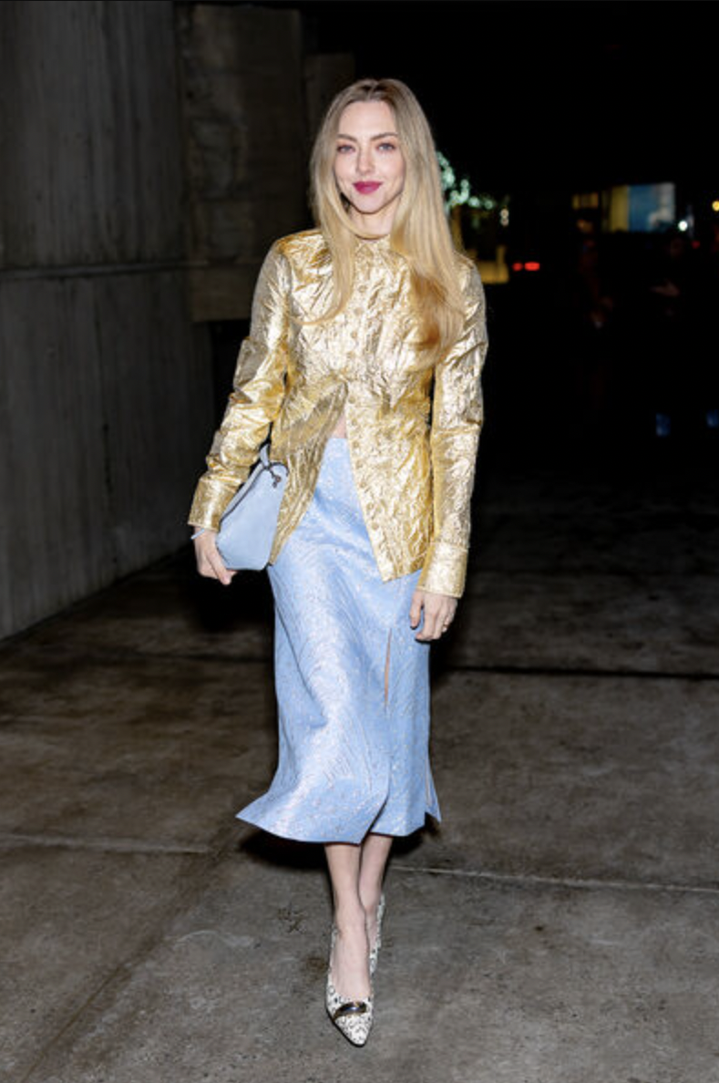 Актриса Аманда Сейфрид в золотой блузе и юбке пришла на показ в Нью-Йорке