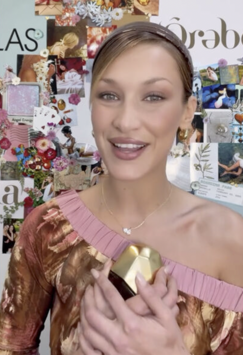 Модель Белла Хадид в топе со спущенным плечом снялась для рекламы духов