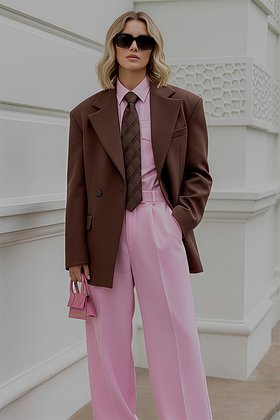 Это сочетание строится на контрастности. Каштановый коричневый, почти верблюжий, уравновешивает сладость и инфантильность цвета жвачки (bubblegum pink), превращая классический образ в стильное высказывание.