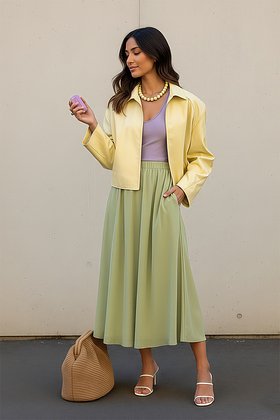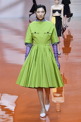 Особенно он приглянулся дизайнерской команде Prada, которые представили в новой коллекции платье с вырезом-лодочкой и жатую юбку в оттенке между лаймом и васаби. Ни тот, ни другой не считаются «легкими» цветами, но это не мешает им весной заполнять магазины.