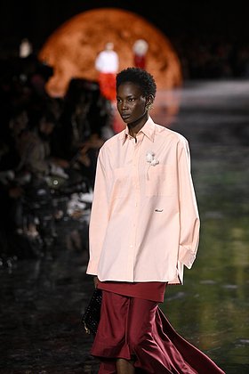 Мягкий розовый — не бледный, но и не кричащий — символизирует современный взгляд на женственность. Новый креативный директор Chanel Матье Блази обратился к наследию французского дома Charvet, создав изысканные рубашки в этом оттенке. Louis Vuitton показали тотал-лук с нежно-розовой юбкой, а на показе Miu Miu розовый буквально украсил подиум и стал сквозной темой коллекции.