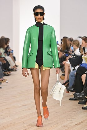 Один из самых ярких дебютов Парижской недели моды — коллекция Loewe от креативного дуэта Джека Маккаллоу и Лазаро Эрнандеса. Изумрудный стал ключевым цветом коллекции, особое внимание модников привлекла кожаная куртка этого цвета без воротника и без швов.