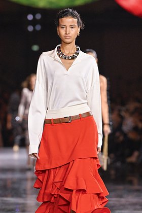 Томатный красный часто появляется на подиумах, но в коллекциях SS26 он обрел новое прочтение благодаря фактуре. Chanel представили томатно-красную юбку, облегающую бедра, а Stella McCartney в новом сезоне предложила носить кожаные брюки томатного цвета с матовым эффектом.