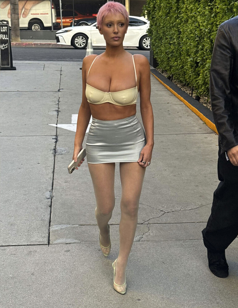 Бьянка Цензори сделала стрижку-пикси и перекрасилась в розовый. С новым имиджем она появилась на прогулке, надев желтый лифчик, серую мини-юбку, колготки и лимонные туфли в сетку.