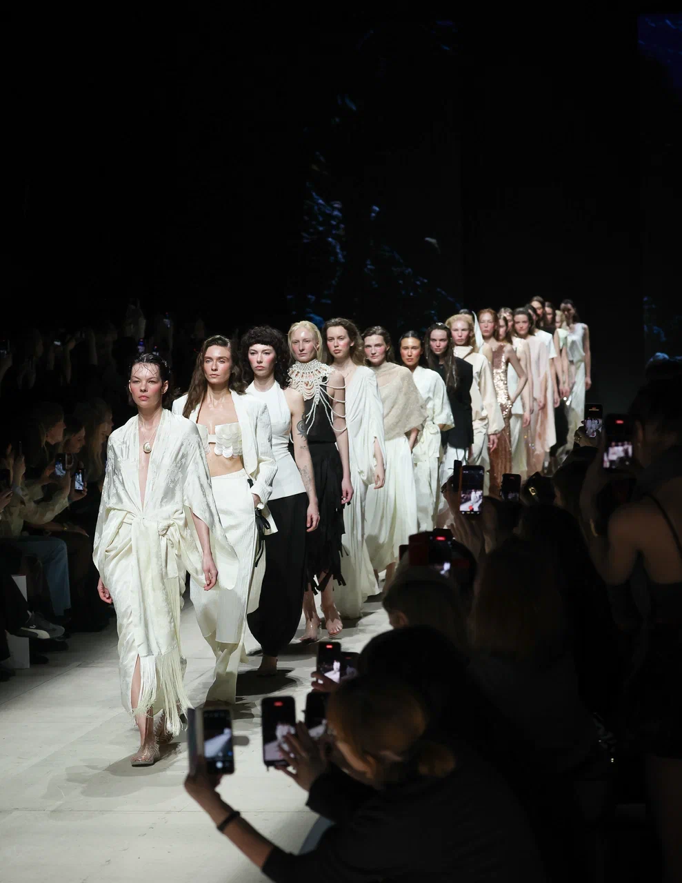 Шестой день Московской недели моды открылся показом коллекции «Масленица», созданной кафедрой «Искусство костюма и моды» РГУ им. А. Н. Косыгина. Студенты воссоздали образы четырех сословий: дворянства с европейским кроем, купечества в ярких фактурах, практичного мещанства и крестьянства с архаичным орнаментом. Визуальной метафорой показа стали фольклорные расшитые образы, сменяющиеся пепельно-темными силуэтами — словно догоревшее масленичное чучело.