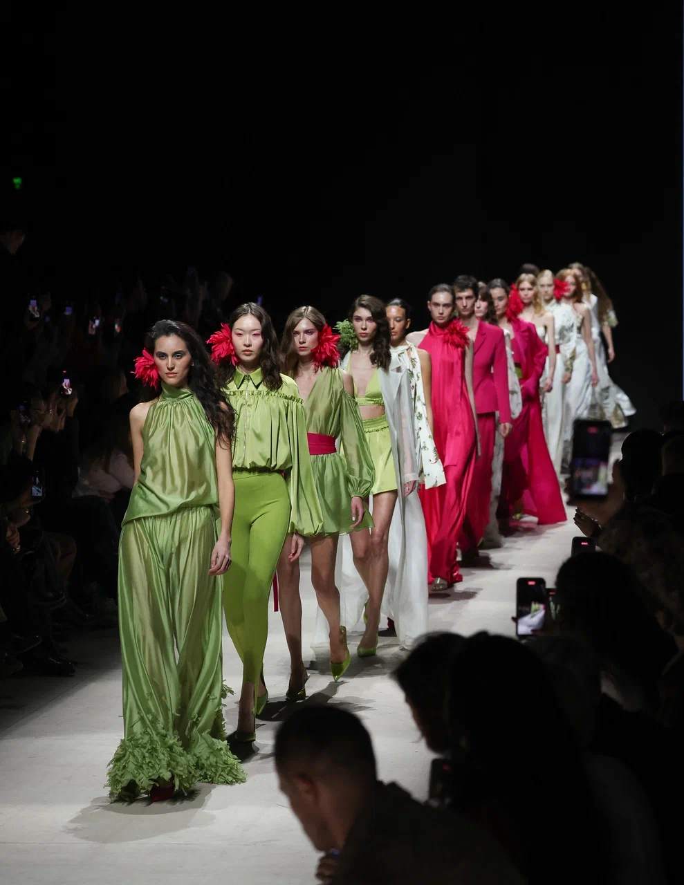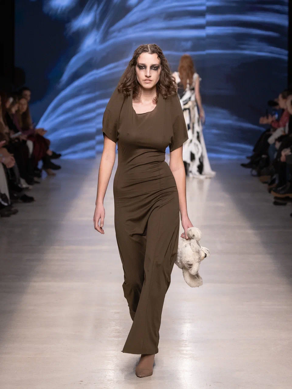 Основательница одноименного бренда Злата Печковская представила коллекцию, вдохновленную гармонией и многообразием природы. Ее визуальный язык строится на игре текстур: перья, бахрома, сетка и полупрозрачные ткани соседствуют с плотными материалами, создавая эффект живых, непрерывно меняющихся форм. Асимметрия, необработанные края и деконструкция подчеркивают мотивы движения и роста. Палитра объединяет мягкие пастельные тона с темными акцентами. Силуэты меняются от приталенных до многослойных.