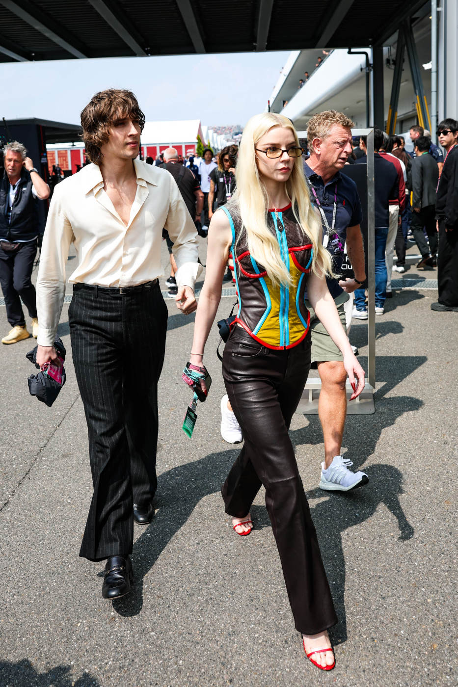 Аня Тейлор-Джой была замечена на VIP-экскурсии по паддоку Формулы-1 в Токио. Автогонщик Льюис Хэмилтон пригласил актрису и ее коллег по мультфильму «Супер Марио: Галактическое кино». Для мероприятия артистка выбрала топ с разноцветными вставками, который сочетала с кожаными брюками-клеш, красными босоножками на каблуках и очками. Знаменитость уложила распущенные волосы и сделала макияж в естественном стиле.