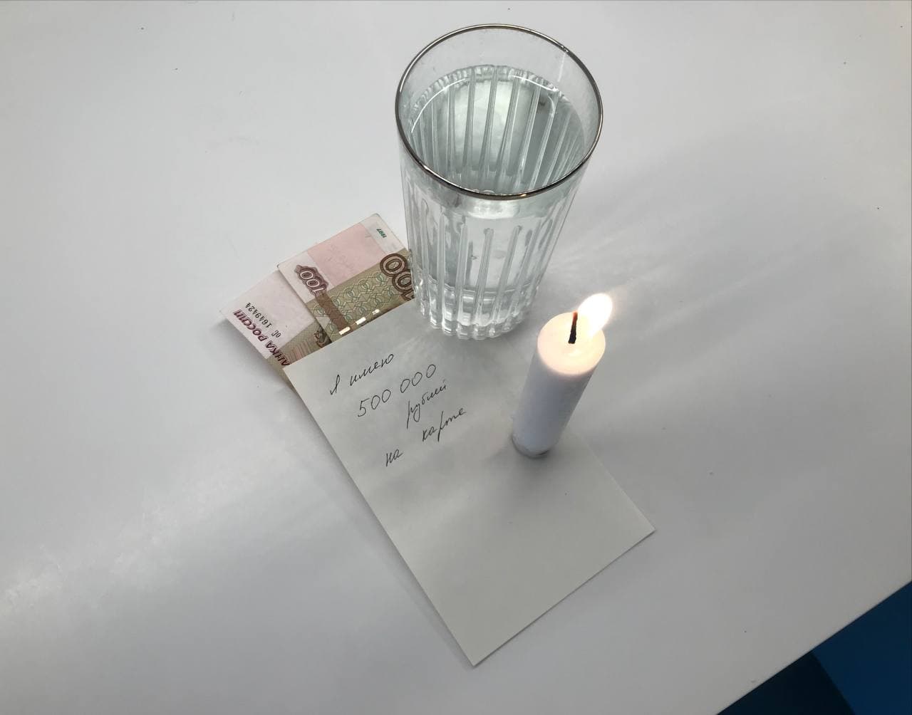 Для ритуала нужно было написать желаемую сумму на листе, положить купюры, поставить на все это стакан с питьевой водой для какой-то там энергии и зажечь свечу, читая над всей этой конструкцией заговор: