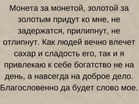 "Я принимаю в свою жизнь 500 тысяч рублей. Я умножаю свои деньги. Вода в моем стакане чиста, ясна, и также ясно я вижу, как Вселенная приносит 500 тысяч рублей в мою жизнь. Пусть наполнятся счета, деньги пусть придут в мой дом также скоро, как сгорит моя свеча..."