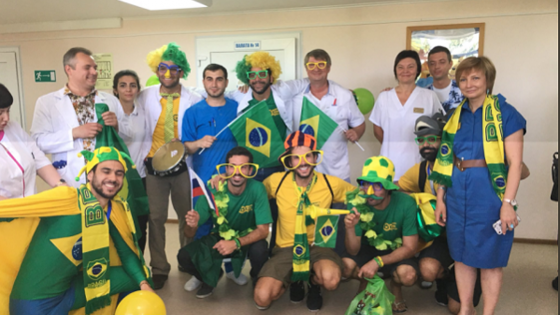 САМАРА, 1 июля. /ТАСС/. Группа бразильских болельщиков устроила в воскресенье праздник для маленьких пациентов Самарской детской клинической больницы №1, сообщил корреспондент ТАСС. Семеро бразильских молодых людей и одна девушка, владеющая русским языком, пришли с утра в больницу с мешками с подарками. Переодевшись в яркие наряды желто-зеленых цветов бразильской сборной, гости, надев шляпы болельщиков и огромные клоунские очки, прошли по этажам больницы, заходя в палаты и веселя детей. Для тех, кто мог выйти из палаты, болельщики устраивали в коридорах общие праздники. Гости знакомились с каждым ребенком и пели в честь каждого песни, танцевали, играли с детьми в футбол воздушными шариками, дарили маленьким пациентам флаги Бразилии и различную атрибутику болельщиков, а также просили их болеть на чемпионате одновременно за две сборные - России и Бразилии. Как рассказали журналистам гости, в составе группы, посетившей самарскую больницу, - два врача, предприниматели, адвокат, студент и журналист. Они представляют общественное движение "Болельщики радости", созданное в Бразилии в 2008 году. Участники движения проводят различные социальные акции для детей. Самара - первый российский город, в котором "Болельщики радости" провели подобную акцию. "Мы, бразильцы, очень любим футбол и хотим принести радость, энергию и атмосферу чемпионата мира детям, которые находятся в больницах. Радость укрепляет иммунитет и помогает побыстрее выздороветь. Мы давно хотели это провести, и когда мы сегодня увидели, как дети улыбаются, - для нас это было ощущением сбывшейся мечты", - рассказал журналистам врач-хирург из Сан-Паулу Фернандо Понтес. Чемпионат мира по футболу проходит с 14 июня по 15 июля. Самара уже приняла четыре встречи группового этапа. 2 июля здесь в матче 1/8 финала встретятся сборные Бразилии и Мексики, а 7 июля пройдет игра 1/4 финала турнира.