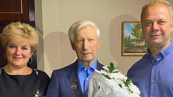 Сергей Дорофеев вручил юбиляру поздравление от губернатора Московской области Андрея Воробьева, памятные подарки и цветы.