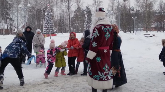Юные жители города веселились и играли с Дедом Морозом и Бабой Ягой, а в завершение праздника получили сладкие подарки.
