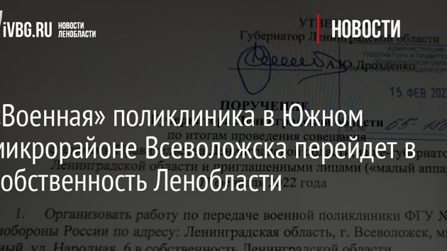 Губернатор Ленобласти поручил передать «военную» поликлинику в Южном микрорайоне Всеволожска в систему регионального здравоохранения. Основанием для поручения стала аналитика ЦУР: действующая амбулатория в густонаселенном микрорайоне не справляется с медицинской помощью. Исполнителями назначены вице-губернаторы Роман Марков и Николай Емельянов, сообщает пресс-служба регионального оперштаба. Ранее Александр Дрозденко принял решение временно усилить Мурино и Кудрово передвижными поликлиниками, чтобы снять огромные очереди в медицинские учреждения.