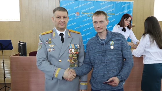 От имени министра спасательного ведомства начальник ГУ МЧС России по Амурской области Игорь Смирнов вручил Максиму Лою и Ивану Мартынову ведомственные медали «За спасение погибающих на водах».