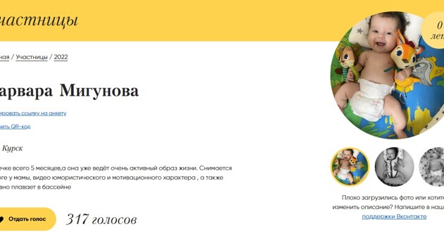 Всероссийский онлайн-конкурс проходит один раз в год, участвовать могут девочки от 0 до 17 лет. Жюри определяет победителей в каждой возрастной категории. 5-месячная Варя из Курска представляет на конкурсе Курскую область. — Варечке всего 5 месяцев, а она уже ведёт очень активный образ жизни. Снимается в блоге у мамы, видео юмористического и мотивационного характера. Она уже плавает в бассейне, — говорится на сайте конкурса. Профессиональное жюри из директоров модельных агентств и партнеров выберут 54 участницы, которым вручат кубки. Голосование длится до 27 декабря. Проголосовать можно здесь.