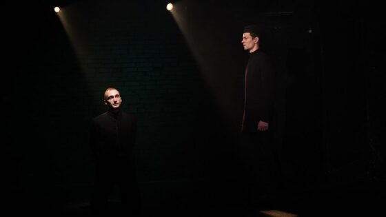 Можно здесь начать с того, что режиссёр и два молодых знаменитых артиста – Никита Каратаев, сыгравший недавно Костю Треплева в «Чайке» Додина, и Никита Сухарев максимально ограничены в своих движениях: они то стоят на посту по стойке смирно, то лежат головами друг к другу, после того, как отрубили 40 тысяч рук, то снова стоят на посту. В пятом эпизоде на посту стоит уже один из героев, в то время когда второй возникает в отдалении, рукава его пиджака висят вдоль от туловища, пусты. Художник по свету Василий Ковалёв смог создать с помощью разнонаправленных лучей софитов с разными цветовыми палитрами пространство действия на крошечной камерной сцене МДТ.