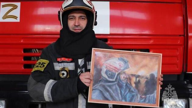 Курская школьница нарисовала портрет пожарного и вручила его герою картины