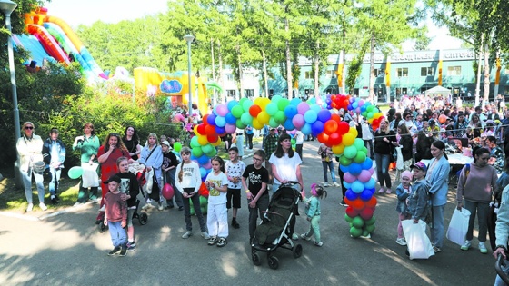 Многодетный отец, начальник одного из отделов завода Тимур Шарипов, привел на праздник троих своих детей. Старшие гуляют с мамой, а он присматривает за самым маленьким. Младший сын в восторге от воздушных шариков, которых здесь море.