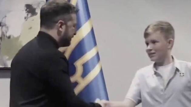 На кадрах Зеленский вручает награду «Будущее Украины» 11-летнему датчанину Йенсу Фогу Томсену, собиравшему средства на покупку рюкзаков для украинских детей.