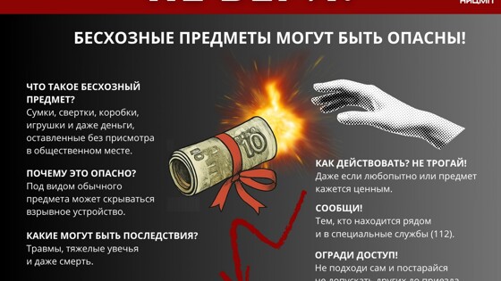 Следственное управление Следственного комитета Российской Федерации по Нижегородской области призывает родителей повторить с детьми основные правила безопасности при обнаружении забытых или бесхозных вещей. Специалисты напоминают основные правила для детей: — никогда не поднимать с земли никакие бесхозные предметы; — никогда не брать в руки оставленные (забытые) вещи, в том числе на скамейках, в транспорте, на улице, в магазинах и других общественных местах Это касается всего — денег (купюр, монет); пакетов, свертков, коробок; электронных устройств (телефонов, пауэрбанков, флешек); игрушек, банок, бутылок с жидкостью; конфет, спичечных коробков и т. п. Даже самая обычная на первый взгляд вещь может оказаться опасной приманкой. Подобные предметы могут быть специально помещены с противоправной целью и с целью причинения вреда жизни и здоровью людей в местах массового пребывания граждан, вблизи образовательных учреждений и игровых площадок. Родителей просят ознакомить детей с алгоритмом действий в случае возникновения ситуации, связанной с обнаружением бесхозных предметов. О любых подозрительных сумках, коробках и иных предметах необходимо незамедлительно оповестить педагогов или сотрудников охраны школы, административного учреждения, водителя транспорта. При обнаружении подозрительного предмета необходимо незамедлительно отойти от него и позвонить по телефонам экстренных служб: 101, 102 или 112. Региональное следственное управление СК России обращается к каждому родителю: будьте бдительны и ответственно подойдите к сохранению жизни и здоровья своего ребенка! Обучение правилам безопасности позволит ребенку чувствовать себя уверенно и уметь находить верные решения в сложных ситуациях.