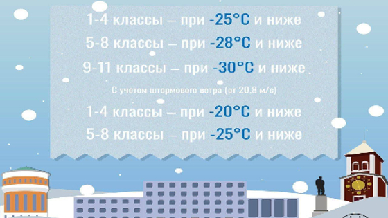 1-4 классы: отменяются при температуре -25°С и ниже. 5-8 классы: занятия не проводят при -28°С. 9-11 классы: посещают школу, пока температура не опустится ниже -30°С.