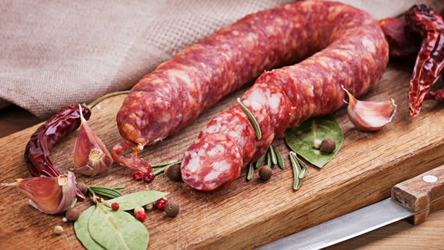 Сало хорошо промыть, просушить, натереть солью, чесноком и положить в холодильник на десять часов. Свежую телятину нарезать небольшими ломтиками, добавить соль, сахар и немного перца. В таком виде выдержать мясо в холодильной камере на протяжении суток. Затем мелко нарезать свиное сало или пропустить через мясорубку. Перемешать сало с мясом, а затем добавить оставшиеся сахар и соль, влить коньяк или водку. Перемешать, приступить к формированию колбасок. Используя большую воронку или мясорубку, наполнить кишки фаршем и хорошо утрамбовать, после чего перевязать концы изделия толстыми хлопчатобумажными нитями или шпагатом. Затем подвесить колбасу за конец в прохладное место (на сквозняк). Приблизительно через 2-3 дня колбаски начнут подвяливаться. Готовыми к употреблению они станут на 10-11 сутки.