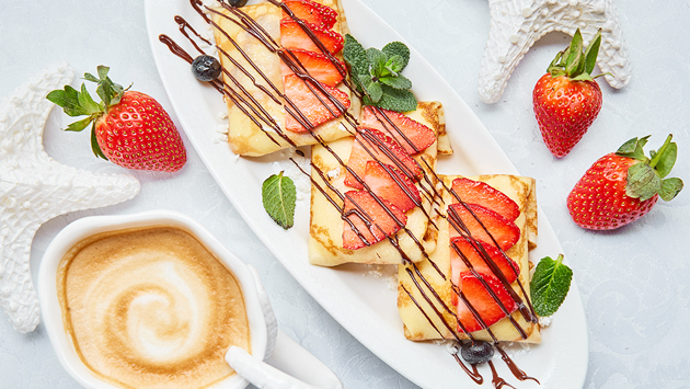 Вам понадобится: Для блинов: Молоко - 1 л Яйцо – 7 шт Сахар – 100 г Соль - 5 г Мука - 320 г Масло растительное - 20 г Для начинки Сливки 33-35% - 100 г Пюре маракуйя - 150 г Яйцо - 4 шт. Сахарный песок - 275 г Крахмал кукурузный - 30 г Желатин листовой - 6 г Вода - 70 г Для украшения: Горяций шоколад – 5 г Свежая клубника – 30 г Приготовление: Смешать все ингредиенты для теста и отпечь блины. Пюре маракуйи довести до кипения, добавить сливки и еще раз довести до кипения. Яйца разделить на желтки и белки. Желтки соединить с сахаром (75 г), тщательно перемешать, добавить крахмал, перемешать и добавить в смесь пюре маракуй со сливками. Довести до кипения, затем снять с плиты и добавить заранее замоченный желатин, охолодить. Отдельно из оставшихся белков приготовить меренгу. Белки взбить. Сахарный песок (200 г) залить водой и довести до кипения. Затем постоянно помешивая влить сахарный сироп в белки. Смешать две массы – пюре и меренгу и начинить ей блинчики. Сверху украсить свежей клубникой и полить шоколадом. Фото: архив ресторана