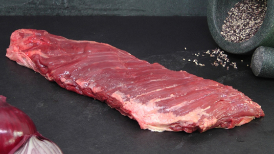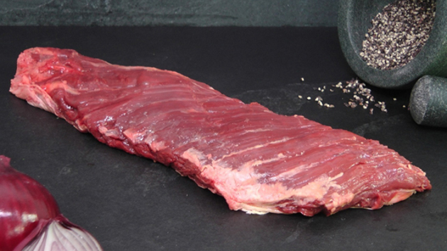 Стейк мачете — частый гость на страницах меню стейк-хаусов. За броским названием скрывается неприхотливый отруб, который способен стать отличной альтернативой более дорогим кускам мяса. Современные стейкмастеры давно говорят о том, что за альтернативными отрубами будущее. Мачете, или как его еще называют — скерт стейк, один из главных претендентов на успех. Такое мясо обладает высокой мраморностью, имеет отличную жесткость и прекрасный вкус. Тем не менее, чтобы приготовить такой стейк самостоятельно, вам потребуются некоторые хитрости и понимание специфики этого типа мяса. — Терминология — В мире существует несколько мясницких систем, в каждой из которых есть свои обозначения для одних и тех же отрубов. В англоязычной традиции такие стейки называют скерт. Этот отруб вырезают из диафрагмы животного. Скерт стейк представляет собой вытянутую мышцу, прикрепленную к ребрам. На русской мясницкой карте эту зону туши называют челышко — грудинка. Во всех случаях такое мясо может попасть к вам в двух видах — очищенным от жира или со всей массой жировых прослоек, которые свойственны диафрагме. — Обработка — Как и другие альтернативные отрубы, этот тип мяса требует дополнительной обработки. Освоить ее в данном случае несложно. Говяжье мясо в области диафрагмы имеет явно выраженную слоистую структуру. Тут можно легко обойтись маленьким острым ножом для обвалки мяса. Результат оправдывает усилия — в итоге вы получите нежный кусок мяса, который можно сделать еще лучше при правильном приготовлении. Нужно стремиться к тому, чтобы получить цельную мышцу с сохраненными волокнами и небольшим слоем жира. Такой тип скерт стейка особенно ценен своим вкусом. — Маринад — Довольно часто для такого типа стейков используют различные маринады. Скерт стейки часто маринуют в довольно агрессивной среде, например, в тайской смеси из чили, чеснока, имбиря и зелени. Подробнее о выборе маринадов для стейка можно прочитать тут. — Жарка — Грудинка имеет особый тип волокон мяса, к которым нужен определенный подход. Главное правило здесь — стабильный и мощный жар, который позволит равномерно приготовить мясо, не пересушив его. Эти отруба, как правило, довольно тонкие и имеют склонность к пригоранию. Поэтому советуем вам использовать для приготовления толстостенные чугунные сковороды. Сам стейк нужно смазать маслом и посыпать специями. На сковородку масло лить не нужно. Вполне уместна будет веточка розмарина, которую можно жарить вместе с мясом. — Нарезка — Не стоит лишний раз напоминать о том, что любому стейку нужно немного отдохнуть, перед тем как вы подадите его на стол. Однако в случае со стейком мачете вам придется немного потрудиться ножом и вилкой. Нарезать скерт стейк нужно под углом около 50 градусов к волокнам, на мелкие сегменты так, как показано на фото.