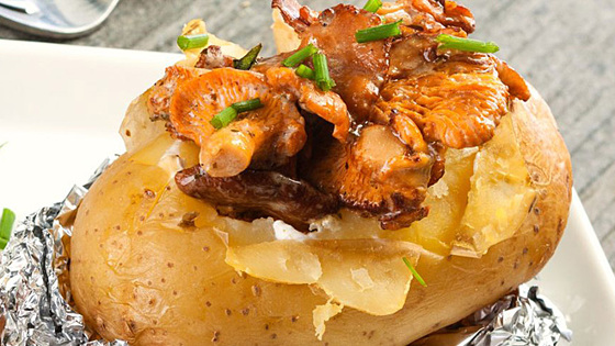 В сочетании с начинками печеный картофель из походного блюда превращается в оригинальный гарнир. Чем именно дополнить картофель — подскажут ваши вкусовые предпочтения. Стопроцентно беспроигрышный вариант — травы и грибы. Ингредиенты: 8 шт. картофеля 1/2 чашки рапсового масла 2 ст.л. сливочного масла 1.8 кг. смешанных лесных грибов 1 шт. белого лука, мелко нарезать 4 шт. зубчик чеснока, измельчить 240 мл. сухого белого вина 240 мл. мясного бульона 1 ст.л. нарезанного эстрагона 1 ст.л. нарезанного тимьяна Соль и свежемолотый перец по вкусу Приготовление: 1. Разогреть духовку до 220 °C. Проткнуть картофель вилкой и смазать маслом. Выпекать около 1 часа (в зависимости от размера клубнй) или до мягкости. 2. Между тем в большой сковороде растопить сливочное масло с рапсовым маслом. Добавить грибы, приправить солью и перцем. Обжарить на сильном огне, помешивая, до мягкости, 20 минут. Добавить лук и чеснок и готовить, помешивая, пока грибы не приобретут золотистый цвет, 8 минут. Влить вино и варить, пока оно не выпарится. Добавить бульон, эстрагон и тимьян, довести до кипения. Приправить солью и перцем. 3. Разрезать картофель вдоль, вынуть частично мякоть. Приправить солью и начинить грибным рагу.